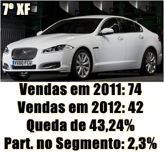 O segmento de Sedãs Grandes de Luxo cresceu em relação à 2011, principalmente ao número de modelos! Só em 2012 nada mais nada menos que 4 modelos chegaram neste segmento, que possui preços de R$150.000 à R$250.000! Entre as 4 novidades, temos: Hyundai Genesis, Volkswagen CC, e os Lexus IS300 e ES350! Entre os modelos que mais cresceram foram apenas o Chrysler 300C com incrível crescimento de 3.837,5% e o Audi A5 com 18%! Os modelos que mais caíram foram: BMW Série 5 com 65%, seguido do Chevrolet Omega com 45%, Jaguar XF com 44% e do Mercedes-Benz Classe E com 43%!